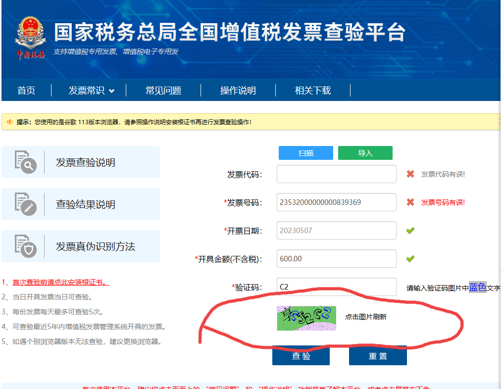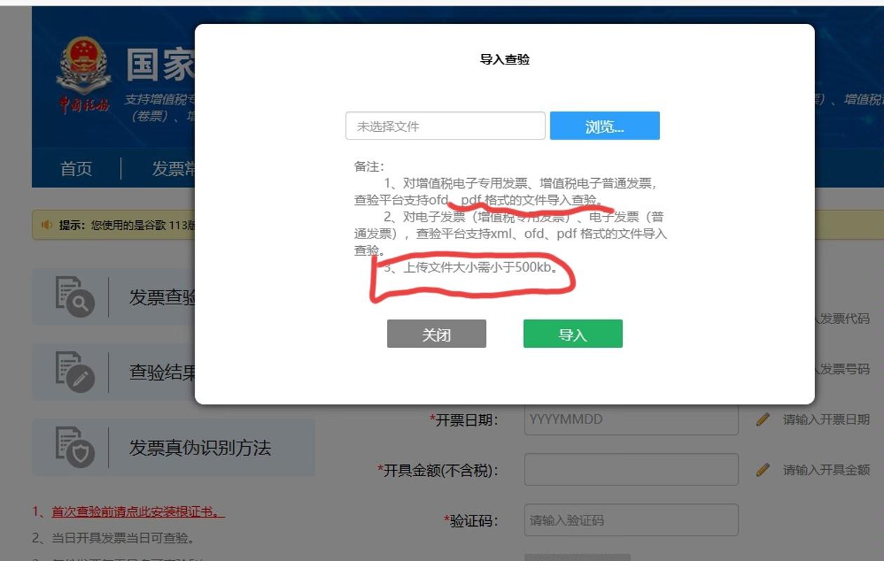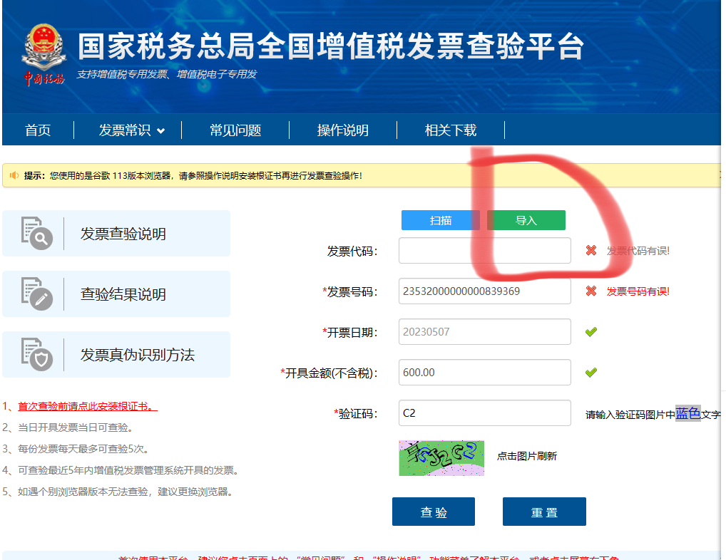 2、导入后,按要求输入验证码。如果提示发票号码有误请忽略。点击查验即可。