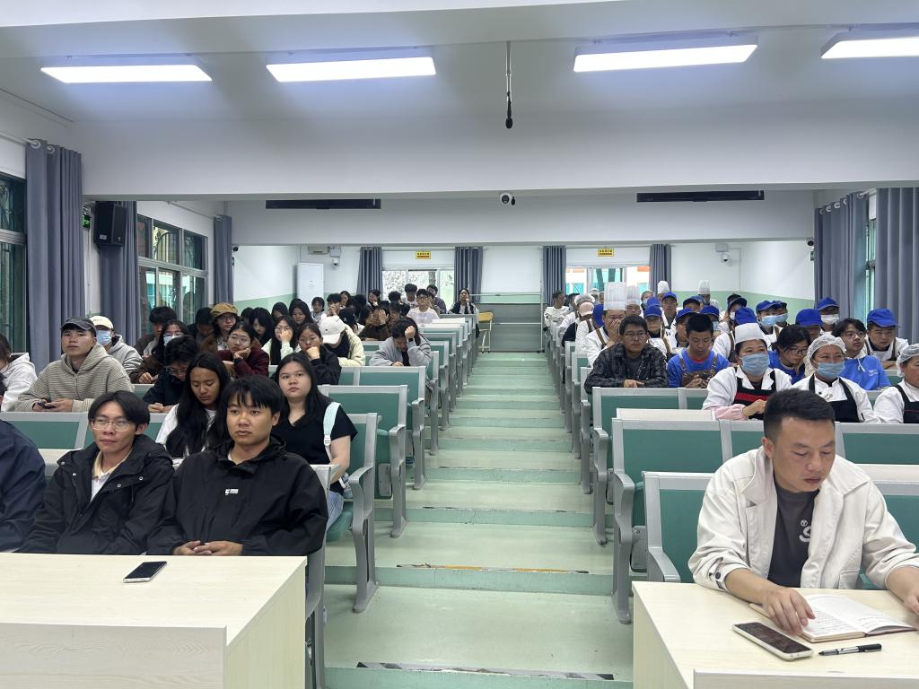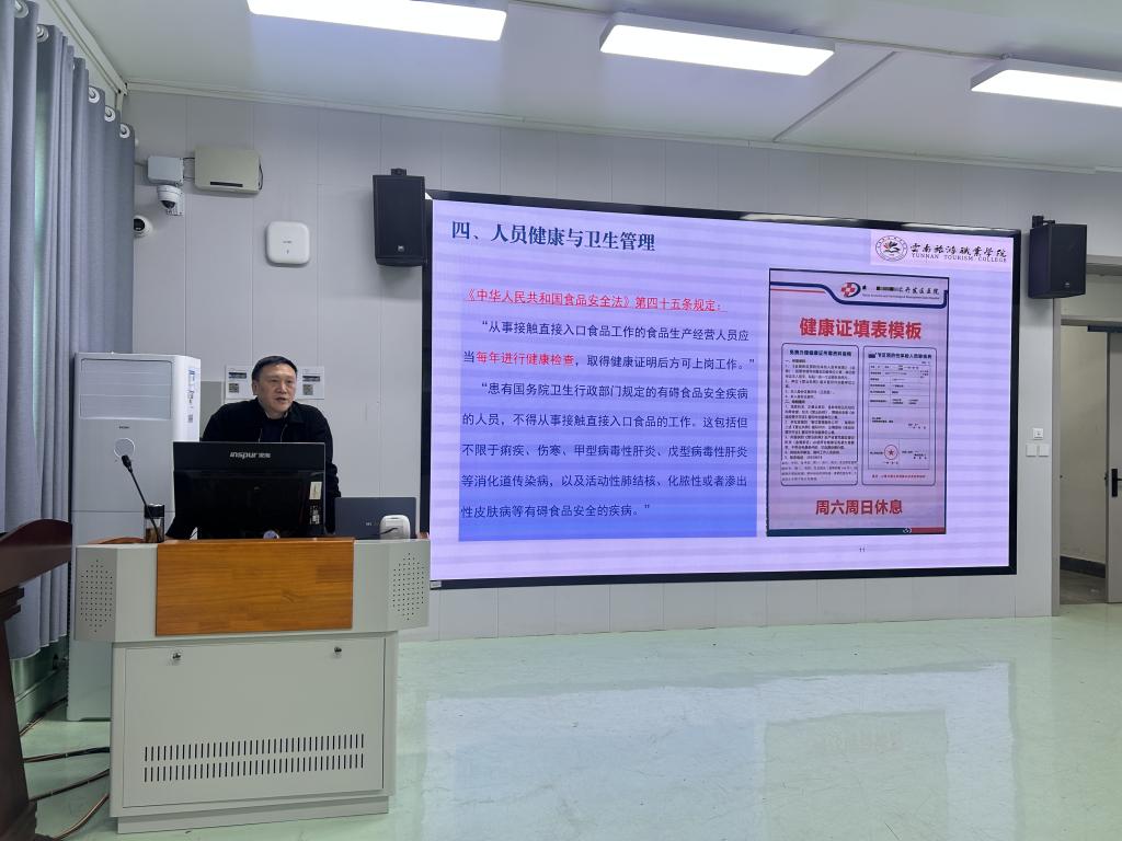 培训由中心副主任叶之府主持,他强调校园食品安全事关师生切身利益,从业人员需将安全规范落实到实操各环节,同时指出校园食品安全需多方协同,此次培训也将搭建食堂与师生的沟通桥梁,主动接受监督。学院食品安全总监张嵩担任主讲,紧扣校园食堂运营实际,系统讲解食品安全法规、健康管理、采购加工、应急处置等核心内容,重点强调食品留样、餐具消毒等实操要点,解读从业人员健康上岗的硬性规定,内容专业且实用。