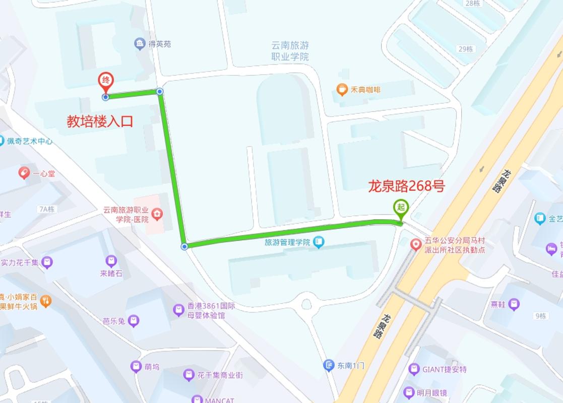 (一)应聘人员须携带身份证、面试通知书,在开考前提前45分钟到达昆明市龙泉路268号云南旅游职业学院教培楼入口处(如下图)进行点名,可乘坐129路、84路、9路、175路公交车在上马村站下车,从东南门进入云南旅游职业学院。
