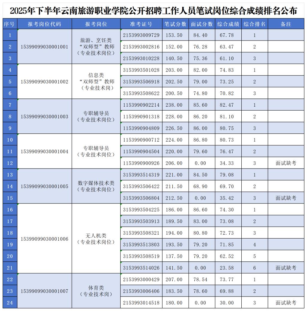 根据《2025年下半年云南旅游职业学院公开招聘人员公告》等有关规定及相关要求,云南旅游职业学院2025年下半年公开招聘人员笔试岗位面试测评工作已完成,面试测评成绩已当场公布,现将综合成绩予以公布如下。