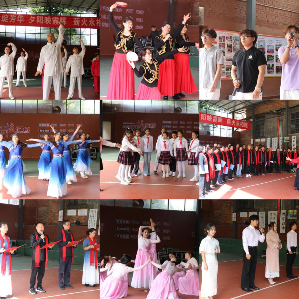 文艺表演环节精彩纷呈。街舞社同学们带来的啦啦操《美丽中国》、龙泉路小学的同学们带来的说唱剧目《信仰的答卷》及大学生艺术团流行演唱队的小合唱《奉献》展现了新时代青年的精神风貌;老体协拳剑队的健身操《八段锦》、老体协舞蹈队的《雨巷佳人》、老体协读书会的朗诵《红色家书》、老体协合唱队带来的合唱《在太行山上》与《新时代的火箭军》等节目,彰显出退休老教师们对祖国、对生活的热爱和对中华优秀传统文化的传承。青年学生与老教师通过文艺表演的跨年龄对话,既传达着青年对老年的尊重与敬爱,又诉说着老年对青年的希冀与期盼。