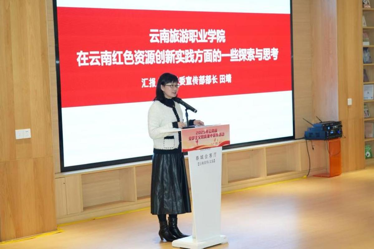 我校党委委员、宣传部部长、马克思主义学院党支部书记田靖以“云南旅游职业学院在云南红色资源创新实践方面的一些探索与思考”为题进行经验交流分享,获得了在场领导的高度认可和参会人员的一致好评。