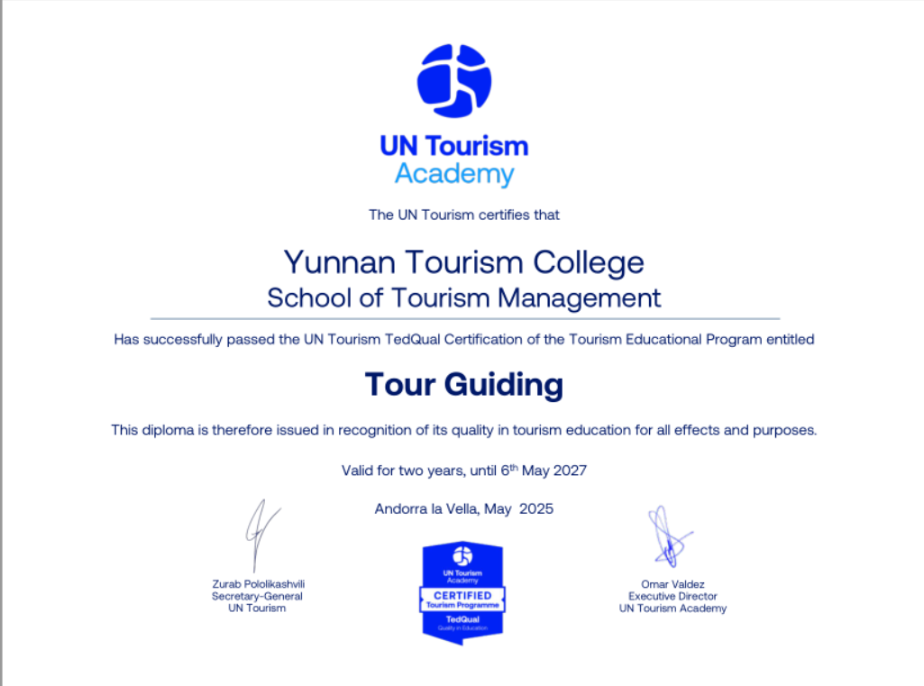 4月,导游专业顺利通过联合国世界旅游组织(UN Tourism)TedQual教育质量认证,成为云南省首个获此国际权威认证的高职专业。7月,酒店管理与数字化运营专业圆满完成认证工作。未来,学校将致力于实现旅游类专业认证全覆盖。