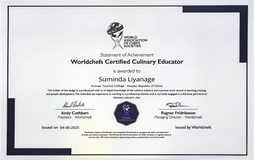 (一)斯里兰卡籍外教苏明达:烹饪学院西餐烹饪专业教师,始终秉持着高度负责的态度,对待教学兢兢业业。他主动开拓创新,积极探索西餐烹饪教学的新模式、新方法,为西餐烹饪专业的发展注入了源源不断的动力,给予了专业建设极大的支持与助力。6月,鉴于在烹饪专业领域作出的贡献,他成功荣获世界厨师协会(World Association of Chefs Societies,简称WACS)“全球认证”烹饪教育者资质,成为首位在中国获此殊荣的烹饪教育工作者,这一成就提升了学校在国际烹饪教育领域的影响力。