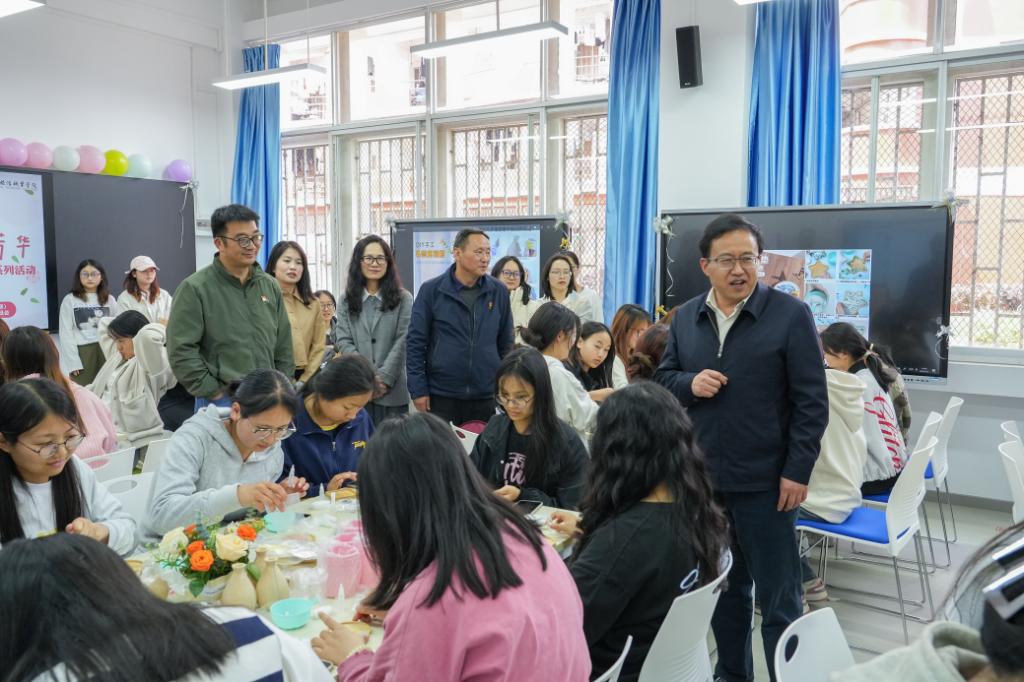 活动期间,党委书记王翔,党委副书记、院长蔡冰,党委副书记、工会主席王敏,党委委员、副院长、妇联主席王霞,党委委员、副院长杨红英、何树称、张磊等学校领导亲临活动现场,与女教职工围坐共同创作、交流构思,闲话家常间送上节日祝福,勉励大家深耕教育事业、为建校70周年添彩。