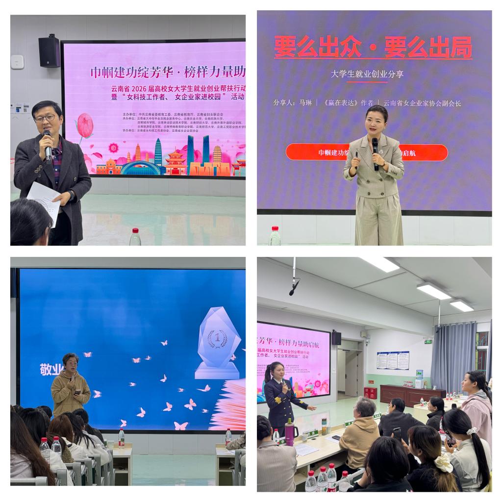 4月1日,2026届云南省高校女大学生就业创业帮扶行动在我校圆满完成。云南省女企业家协会代表马琳、云南省女科技工作者协会代表范源、云南省巾帼劳模、东方航空云南有限公司飞行机长李鑫作为嘉宾走进校园,与我校女大学生面对面交流,共话职业成长与职场发展。