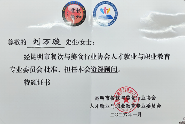 刘万璇担任昆明市餐饮与美食行业协会人才就业与职业教育专业委员会“资深顾问”证书