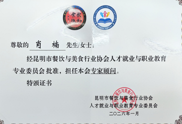 肖楠担任昆明市餐饮与美食行业协会人才就业与职业教育专业委员会“专家顾问”证书