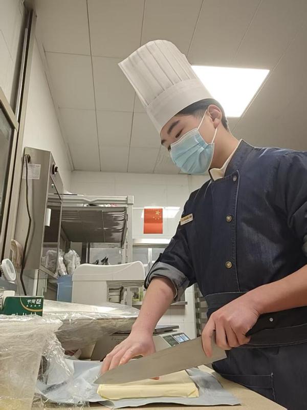 扎根餐饮部后厨饼房的杜忠权同学,以“工匠精神” 潜心钻研面点技艺,在方寸操作台上书写青春担当。从面粉、黄油等原料的精准配比,到发酵温度的细微调控;从揉面、塑形的基础功底打磨,到创意面点的口味融合与颜值呈现,他始终以严谨细致的态度对待每一道工序、每一个细节。实习期间,他主动向资深厨师请教技艺,利用休息时间钻研配方改良,将课堂所学的食材营养知识与实操技能相结合,推出的多款创意面点不仅香气四溢、口感绝佳,更因造型精致获得住客与同事的一致好评。