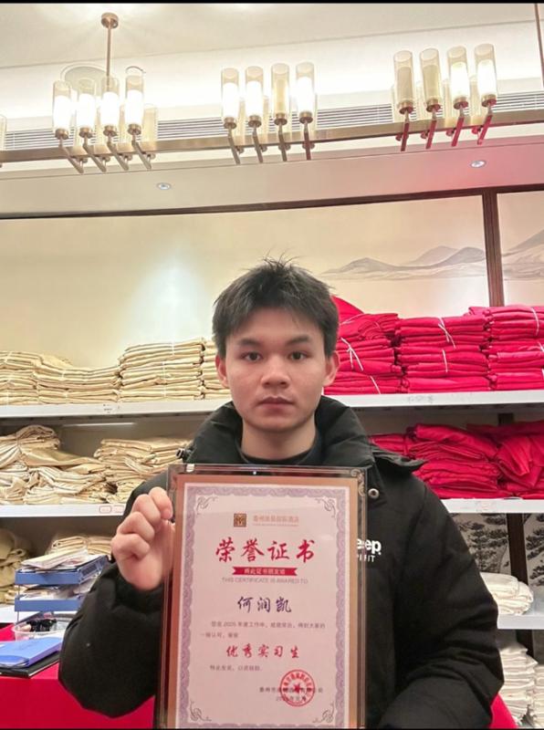 在宴会厅岗位实习的何润凯同学,则在高强度、快节奏的接待工作中展现出极强的综合素养。宴会厅作为酒店大型活动的核心场地,常面临多场次、高规格的接待任务,对服务响应速度、现场协调能力提出极高要求。何润凯同学始终保持昂扬的工作热情,无论是前期场地的精准布置、桌椅的规范摆放,还是活动期间的宾客引导、突发情况应对,他都能高效执行、灵活应变。实习期间,他参与保障了多场大型会议、婚宴及主题活动,凭借清晰的逻辑思维、默契的团队协作能力,多次圆满完成接待任务,用汗水与坚守保障了活动的顺利进行。其积极向上的工作态度与出色的履职表现,赢得了实习单位的高度肯定,成功斩获优秀实习生称号。
