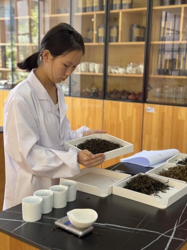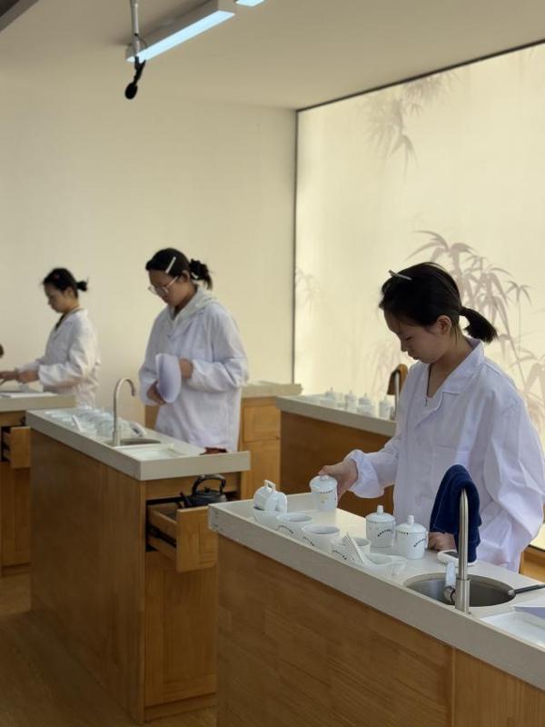 本次认定分为理论知识考核与技能实操考核两大环节。理论考核重点考查学生对茶叶分类、品质特征、加工工艺、审评标准等专业知识的掌握程度;实操考核聚焦中级评茶师核心技能,涵盖干茶外形审评、汤色观察、香气品鉴、滋味评定及叶底辨析全流程。考核现场,考生们身着统一白大褂,神情专注、操作规范。从细致比对不同茶样的条索、色泽,到精准冲泡、分杯品鉴,再到认真记录各项审评指标、撰写审评报告,每一个步骤都严谨细致,充分展现了茶艺与茶文化专业学生扎实的专业功底和良好的职业素养。