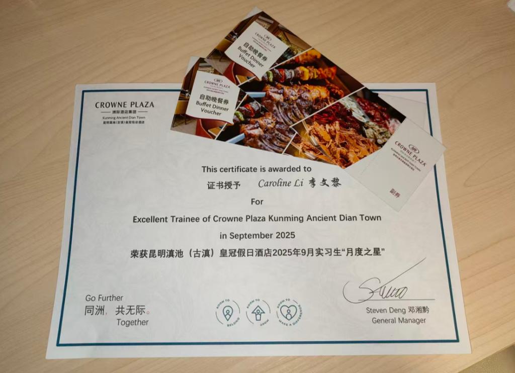 近日,云南旅游职业学院酒店管理学院酒店2304班实习生李文黎,在昆明滇池(古滇)皇冠假日酒店的实习岗位上,以暖心细致的服务、高度负责的态度,成功帮助客人找回遗失物品,用实际行动诠释了职业素养与服务精神,获评酒店当月“月度之星”,为学院学子树立了优秀榜样。