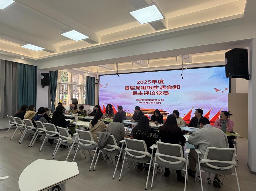 2026年3月18日,旅游管理学院党支部在教培楼214召开2025年度组织生活会暨民主评议党员会议。会议由党支部书记伍乐平主持,学院全体党员参会,应到31人,实到26人,7人请假。学院党委委员、副院长王霞及学院办公室副主任苑文华同志列席。