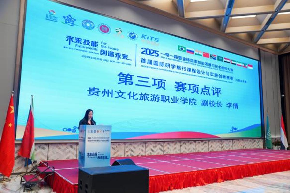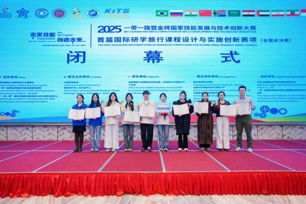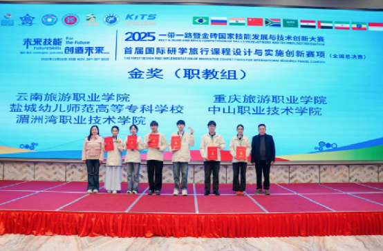 2025年11月26日至29日,2025“一带一路”暨金砖国家技能发展与技术创新大赛之首届国际研学课程设计与实施创新赛项全国总决赛在重庆旅游职业学院圆满落幕。本次大赛汇聚了全国122支参赛队伍、691名师生同台竞技。我校旅游管理学院积极组队参赛,派出1支学生队伍与1支教师队伍出征,最终凭借扎实的专业功底、创新的设计理念与稳定的现场表现,斩获职教组一等奖1项、教师组三等奖1项,指导老师获评“优秀指导老师”,学校荣获“最佳组织奖”,在国家级赛事中全方位彰显了我院研学旅行专业“师生共育、岗课赛证融通”及国际视野人才培养的实力,也充分展现了学校的组织保障能力。