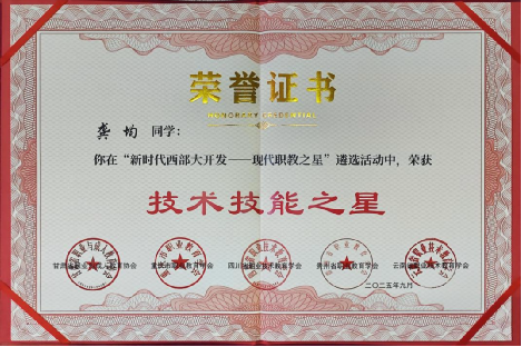 本次评选活动以“赋能西部发展、培育职教英才”为核心,旨在发掘新时代职业教育领域的优秀学子与创新实践成果,为新时代西部大开发战略注入职教力量。评选过程中,评审专家组围绕专业技能水平、实践应用能力、综合素质发展等多维度进行严格考核。龚均、王坤两位同学凭借在校期间的专业技能与学科竞赛,最终斩获殊荣。此次评选全省仅60人入选。