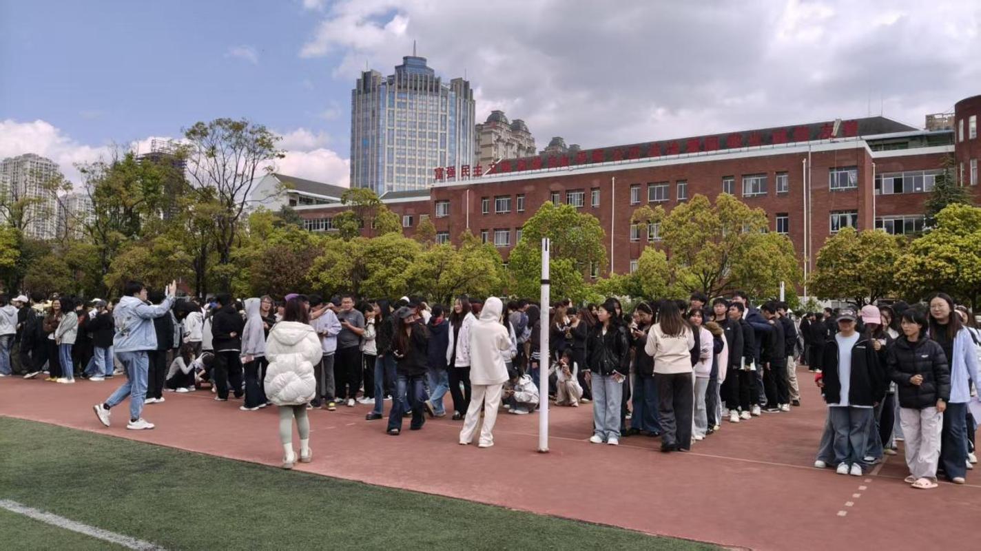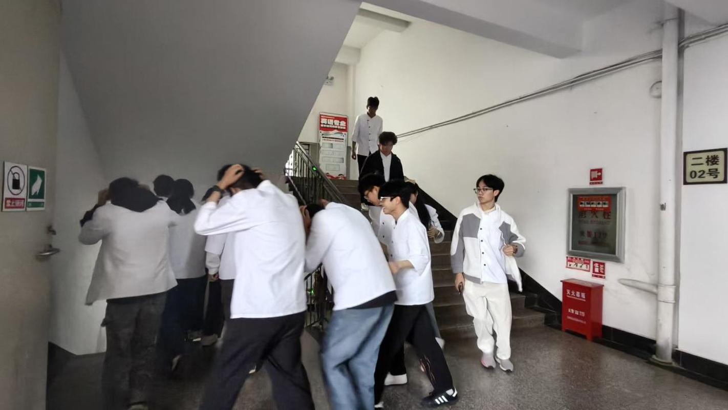 14:05,第二声警报拉响,标志着主震结束,疏散环节开始。在辅导员和班级安全委员的引导下,烹饪学院全体师生按照既定路线,从教学楼和宿舍楼快速撤离。同学们弯腰低姿,沿楼梯右侧有序下行,不推挤、不喧哗。仅用时三分钟,所有参演学生便全部安全撤离至篮球场及足球场等指定空旷地带。到达安全区域后,各班级立即清点人数并向上汇报,确认全员安全到位。