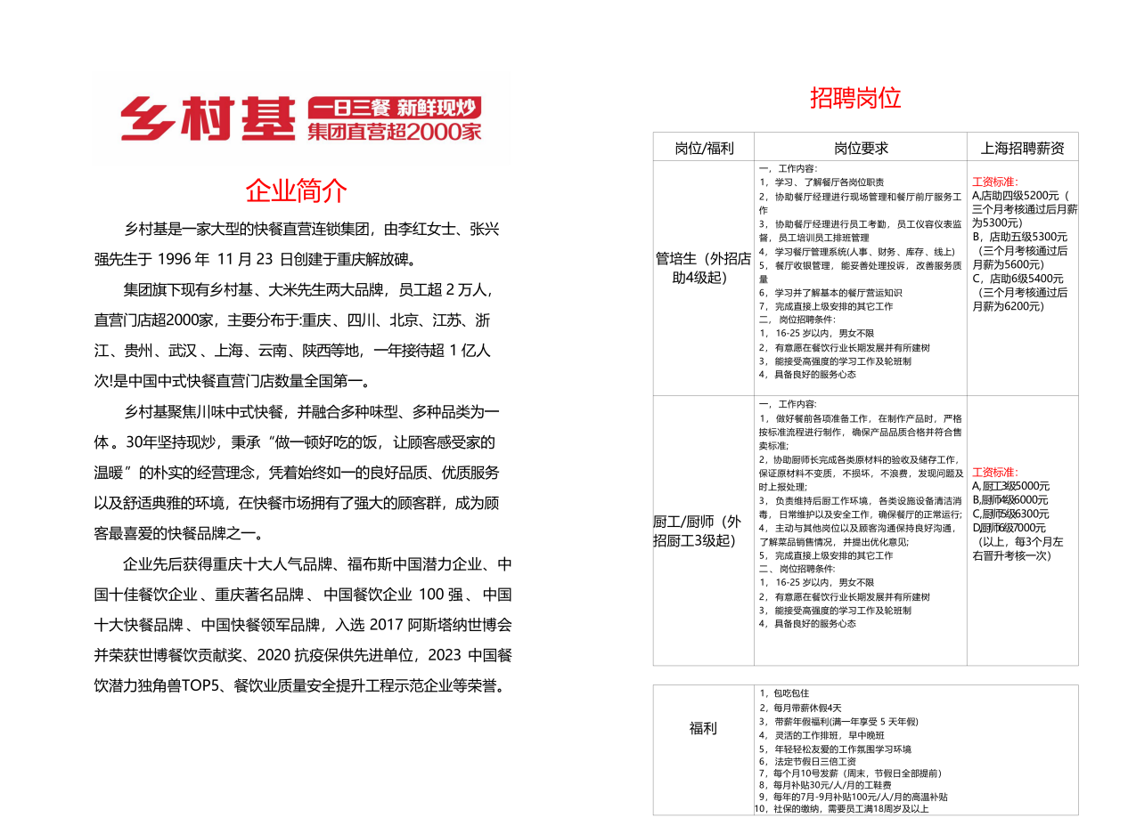 1.公司简介:乡村基集团成立于1996年,旗下拥有乡村基、大米先生两大品牌,直营门店超2000家,员工超2万人,是中国中式快餐直营门店数量全国第一的企业。坚持“一日三餐,新鲜现炒”,为顾客提供家的温暖。