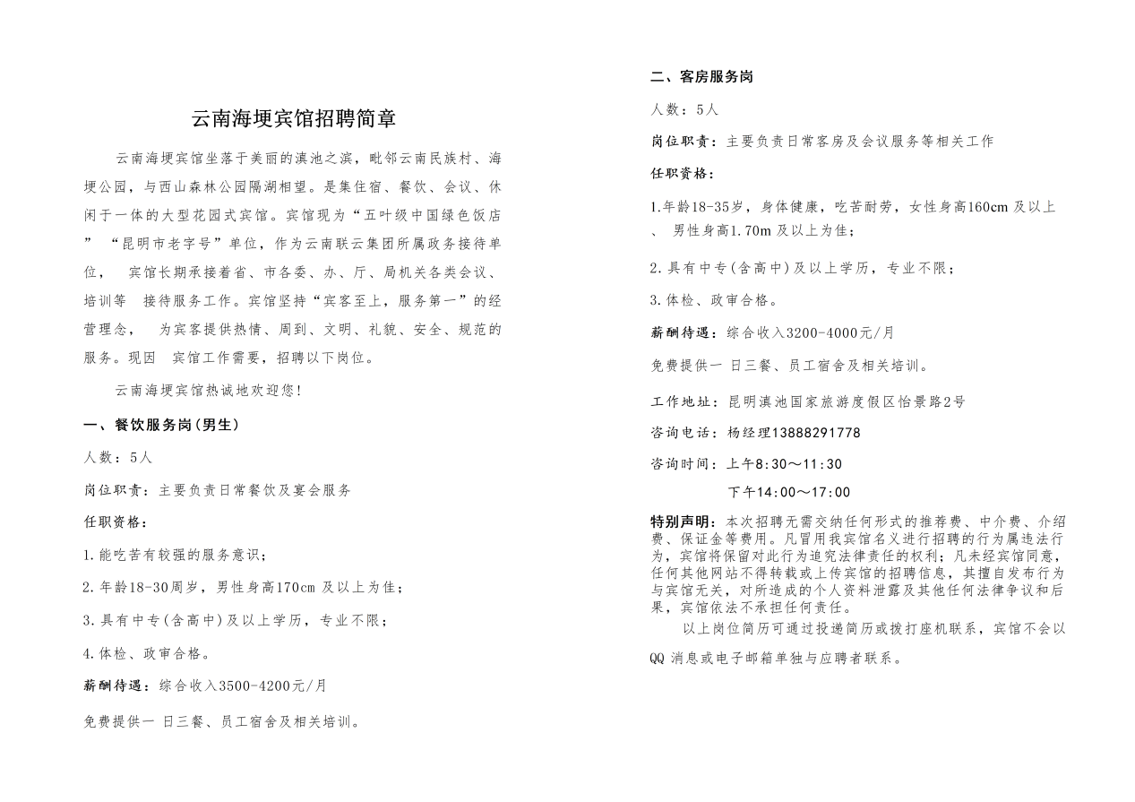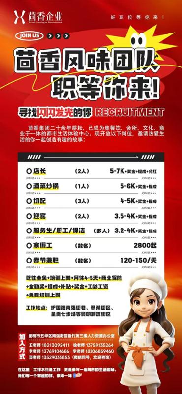 4.工作地址:昆明各门店就近安排,丽江古城店同期招聘。