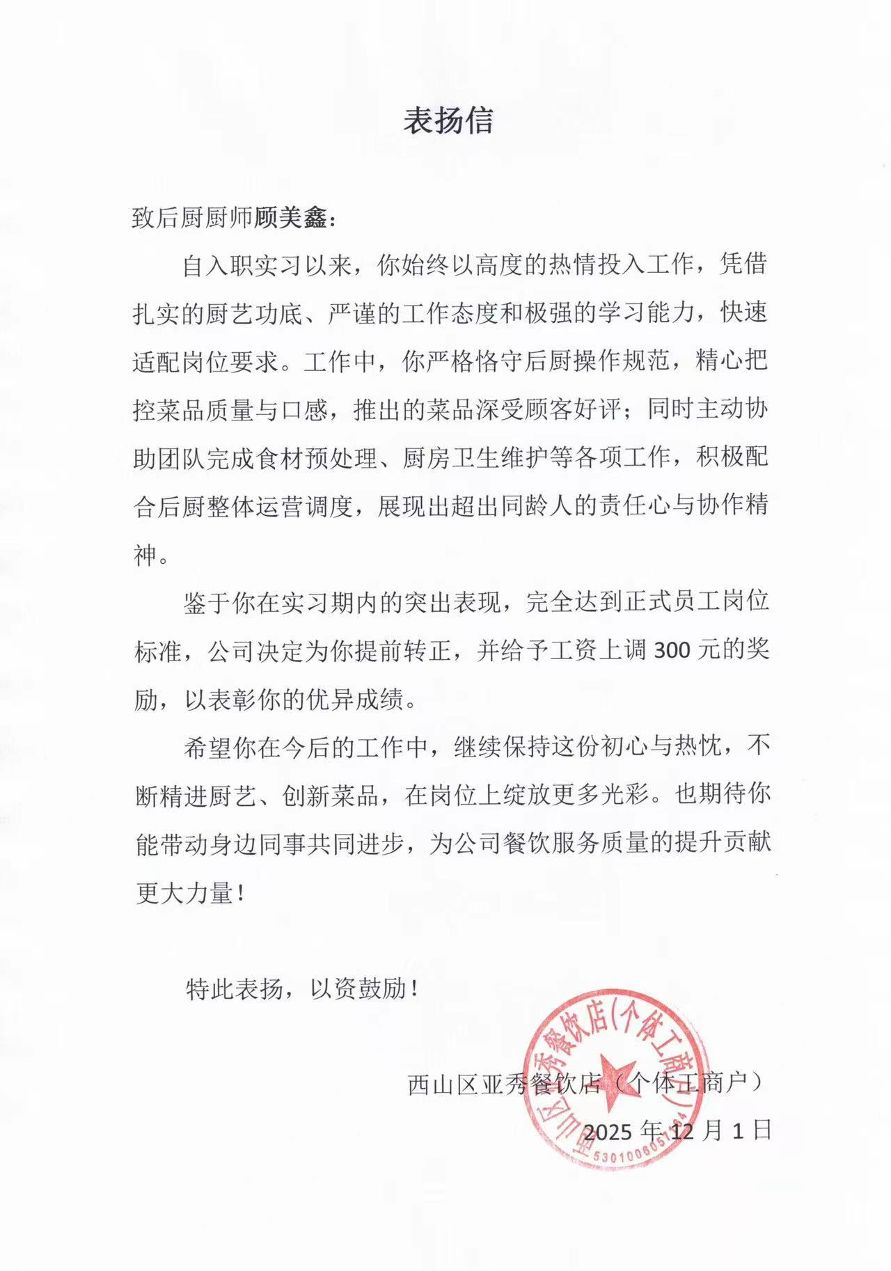 尤为值得一提的是,鉴于顾美鑫同学在实习期间的优异表现——不仅熟练掌握岗位技能、稳定输出高品质菜品,更展现出超越同龄人的职业成熟度与团队担当,实习单位西山区亚秀餐饮店已决定为其提前转正,并上调工资300元以资鼓励。单位在表扬信中特别指出:“你推出的菜品深受顾客好评……完全达到正式员工岗位标准”,充分肯定其专业能力与发展潜力。