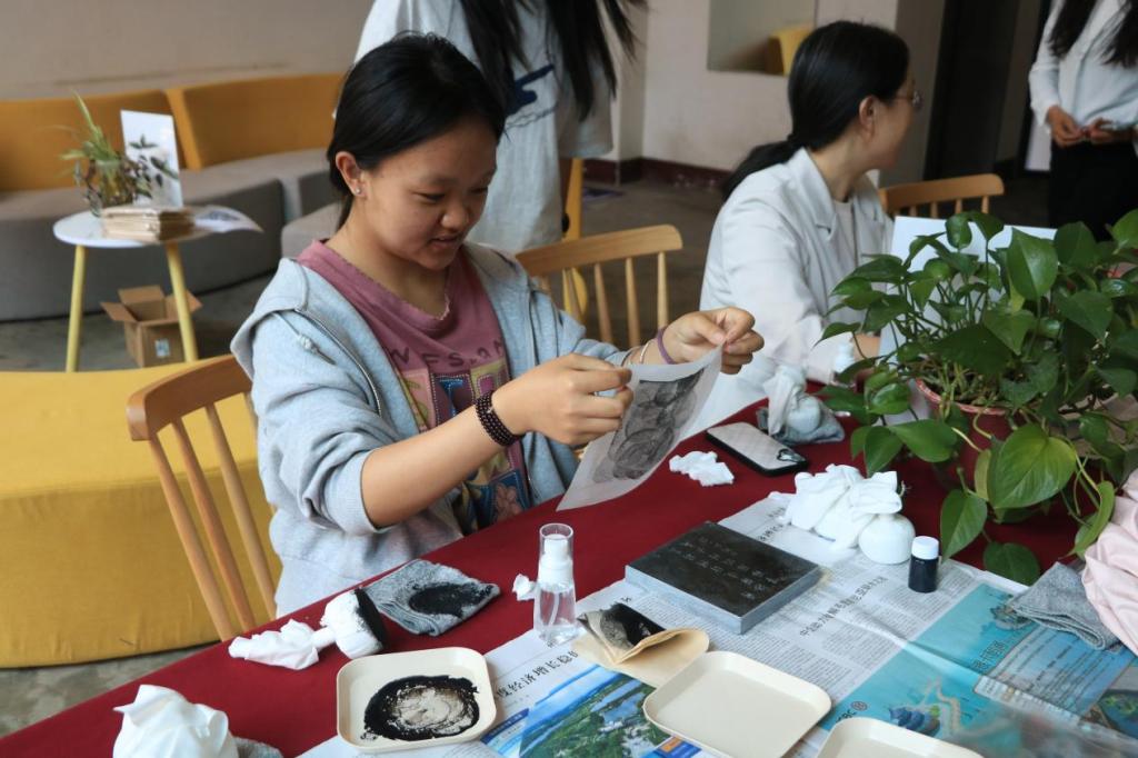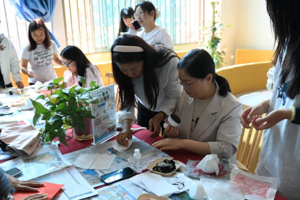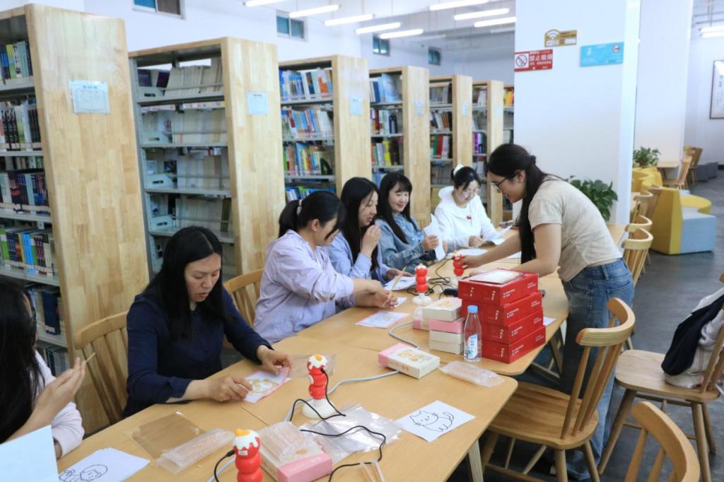 除了主题分享,创意互动体验区同样人气满满。“字里行甜”糖画创作活动现场,师生们围在糖画操作台旁,亲手勾勒出趣味图案,滚烫的糖浆在笔尖流转,化作甜香四溢的创意作品,大家在甜蜜中感受传统技艺与阅读的奇妙碰撞;“墨韵书香”非遗拓印体验区更是热闹非凡,师生们争相体验古法拓印的乐趣,于会超馆长还为大家完成的拓印作品题字,不少师生拿着自己的作品爱不释手,纷纷表示:“这样的活动太有意义了,既体验了非遗文化,又感受到了文字的温度,太喜欢了!”