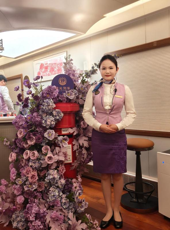 2.杨丽心:央企优秀员工,入职中旅星光旅游列车,在“星光澜湄号”工作期间,依托专业英语功底和教学能力,牵头团队英语培训、策划列车文化活动,妥善处理涉外旅客服务与咨询,将英语教育专业素养与跨文化服务能力深度融合,成为校企人才培养的典型代表。