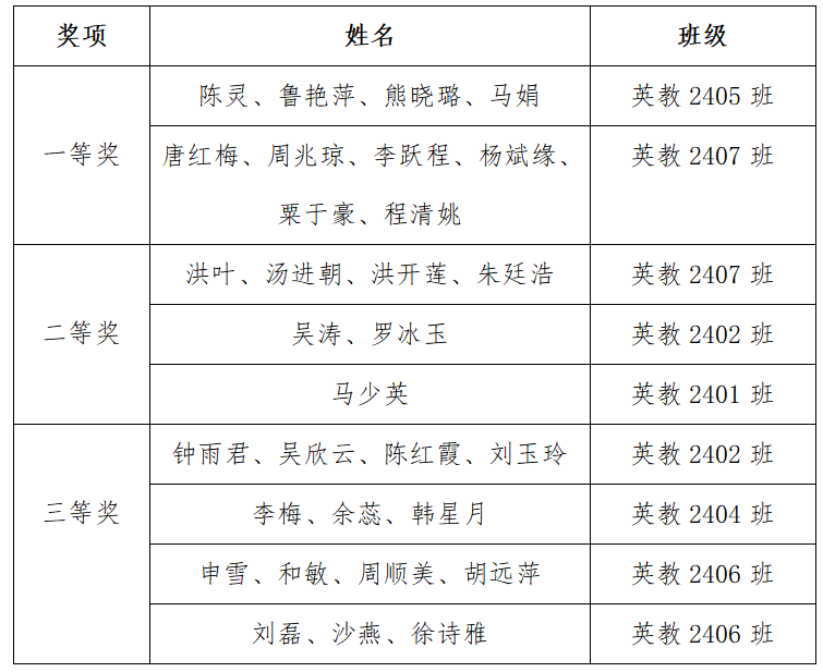 经班级初选、教研室复评,最终9个参赛组脱颖而出晋级决赛。比赛过程紧张有序、精彩纷呈。选手们准备充分,精致的课件、别出心裁的教具、活泼轻快的音乐伴奏、生动流畅的歌喉、自然大方的教态以及环环相扣的教唱设计,完成了《Finger family》《The wheels on the bus》《Do Re Mi》等经典英文儿歌的教唱展示,展现了扎实的专业知识储备、过强的教学技能和良好的教师风采,赢得评委与现场观众的一致好评。获奖名单如下: