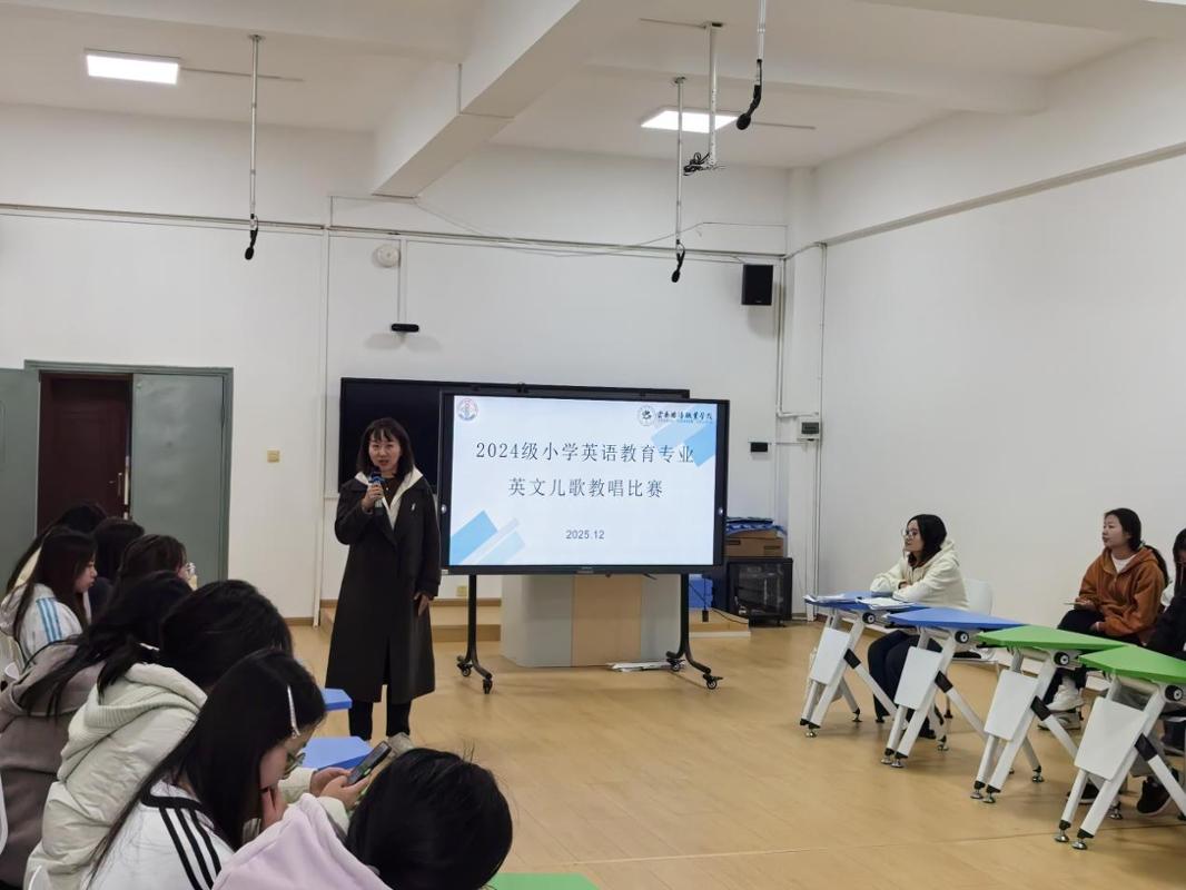 为提升小学英语教育专业学生的教师职业技能、英语语音水平与学科素养,搭建学以致用的实践平台,丰富校园文化生活,小学英语教育专业于12月17日成功举办2024级小学英语教育专业英文儿歌教唱比赛决赛。作为专业第三届英文儿歌教唱赛事,本次比赛创新采用个人赛与小组赛并行的形式,吸引了同学们踊跃参与。