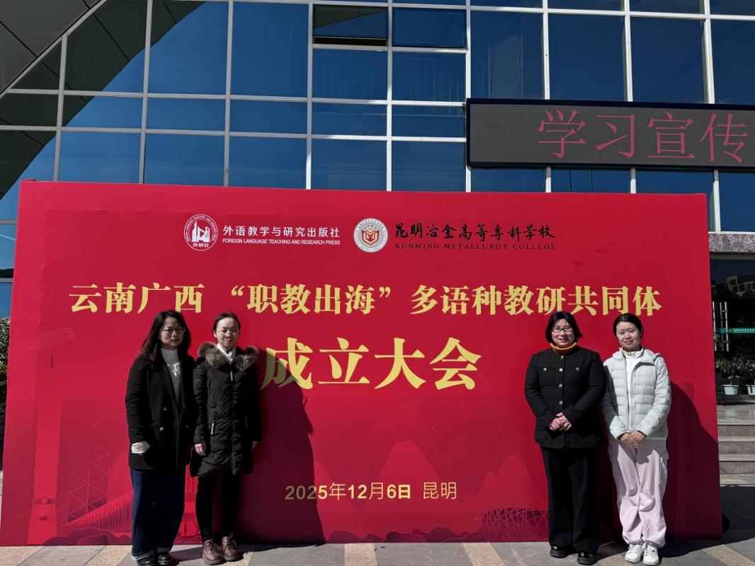 2025年12月6日,云南广西“职教出海”多语种教研共同体成立大会暨昆明冶金高等专科学校外语开放课堂活动在昆明顺利召开。外语学院组织各教研室负责人、专业带头人代表参会,正式加入该教研共同体,与滇桂两省百余名教育同仁共襄职业教育国际化发展盛事。我校成为云南广西“职教出海”多语种教研共同体首批成员单位。