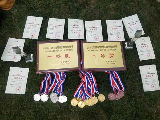 2018年10月25日-29日,由云南省教育厅主办,云南省学生体育协会和昆明学院共同承办的2018年云南省首届校园跳绳锦标赛在昆明学院隆重举行。我校代表队参加了本届锦标赛11个大项的比赛,共斩获包括团体集体项目、单项奖等共计24块奖牌。