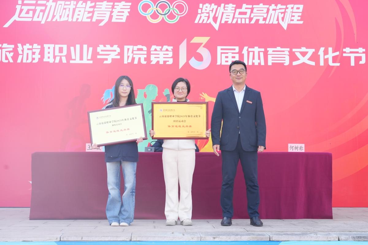 我校领导为本次运动会的获奖团队颁奖。教职工比赛中,教务工会小组摘得桂冠,荣获团体总分第一名。学生比赛中,烹饪学院拔得头筹,在田径比赛和趣味比赛中斩获双金;经济管理学院及旅游管理学院分别获得田径比赛和趣味比赛的体育道德风尚奖;资源工程学院、酒店管理学院、文化艺术学院荣获开幕式入场表演优胜奖。