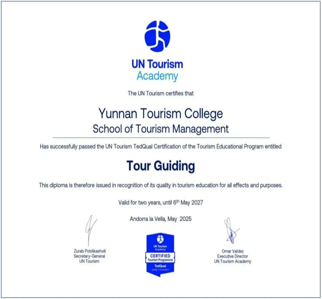 对接国际旅游教育质量标准,申请联合国世界旅游组织教育质量认证(UN Tourism TedQual),增强专业的国际竞争力。导游、酒店管理与数字化运营专业作为典型引路专业,分别于2024年、2025年通过该项权威认证。旅游大类专业通过双高建设,2024年导游专业在云南省专业综合评价中成为唯一的旅游大类B级专业,2025年旅游大类专业B级增加至3个,C+专业增加至3个,11个旅游大类专业排名全省第一,办学质量继续领跑全省同类专业。