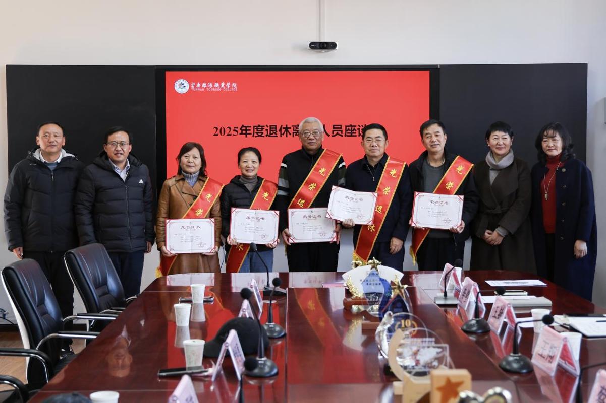 为欢送我校2025年度光荣退休老教师,1月9日下午,由人事处(退休办公室)、工会联合组织的欢送退休离岗教职工座谈会在酒店管理学院三楼实训室举行。党委书记王翔,党委副书记、院长蔡冰出席座谈并讲话,会议由党委委员、副院长杨红英主持。