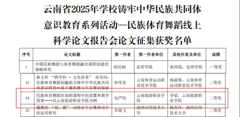 学术研究领域同样捷报频传,我校提交的论文《民族体育舞蹈在高职课程中的设置和教学效果——以云南旅游职业学院为例》,立足高职教育特色,结合学校办学定位,深入探讨民族体育舞蹈与高职课程融合的路径与成效,兼具理论深度与实践价值,在民族体育舞蹈线上科学论文报告会论文征集中荣获二等奖,彰显了我校在民族文化与职业教育融合研究中的扎实积累。