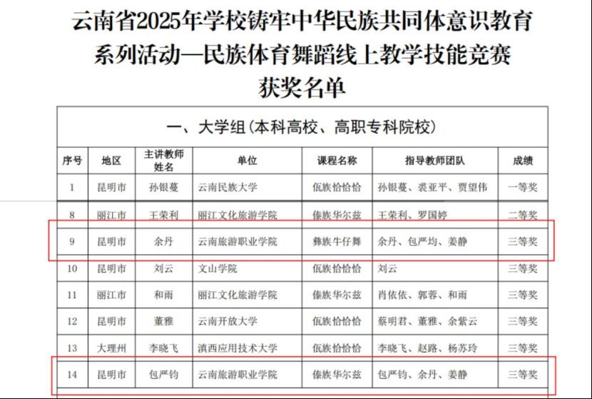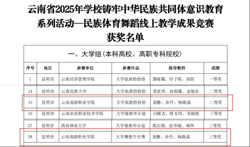 1月29日,云南省教育厅办公室发布2025年铸牢中华民族共同体意识教育系列活动获奖通知,我校在各类竞赛中脱颖而出,斩获2个二等奖、3个三等奖,用实际行动践行文化育人使命,彰显校园民族团结教育的丰硕成果。