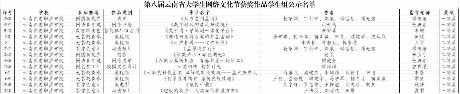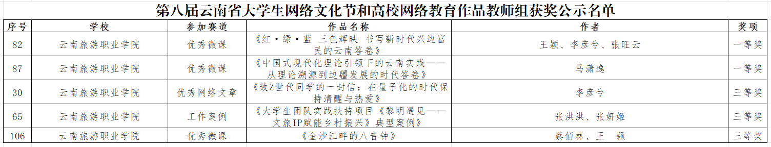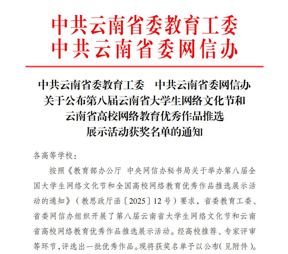 近日,省委教育工委、省委网信办公布了第八届云南省大学生网络文化节和云南省高校网络教育优秀作品推选展示活动获奖名单。我校共18项作品获奖,创历史获奖总数新高。其中,教师组作品获一等奖2项,三等奖3项;学生组作品获一等奖3项,二等奖6项,三等奖4项,彰显了我校在网络思政育人及网络文化建设上取得的扎实成效。
