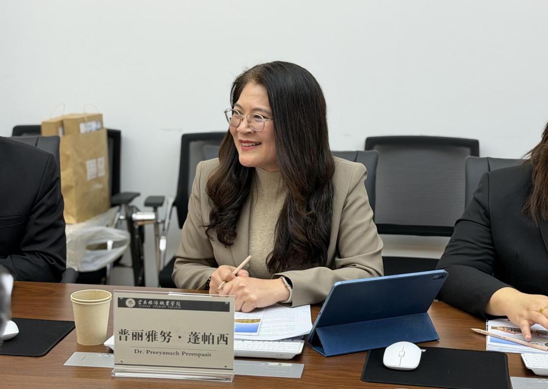 会上,蔡冰院长在致辞中对代表团一行的到来表示热烈欢迎。他表示,中泰两国山水相连、文化相通,旅游和教育领域合作前景广阔,我校高度重视与泰国高校的交流合作。他提出,双方可探索“泰语+技能”“中文+泰语+技能”的复合型人才培养模式,将语言学习与专业技能深度融合,培养既精通语言又掌握旅游、酒店、烹饪等专业技能的国际化应用型人才;可依托云南面向南亚东南亚的区位优势,共同拓展企业在泰国的语言培训、技能培训等合作项目,实现人才培养与企业需求的有效对接。