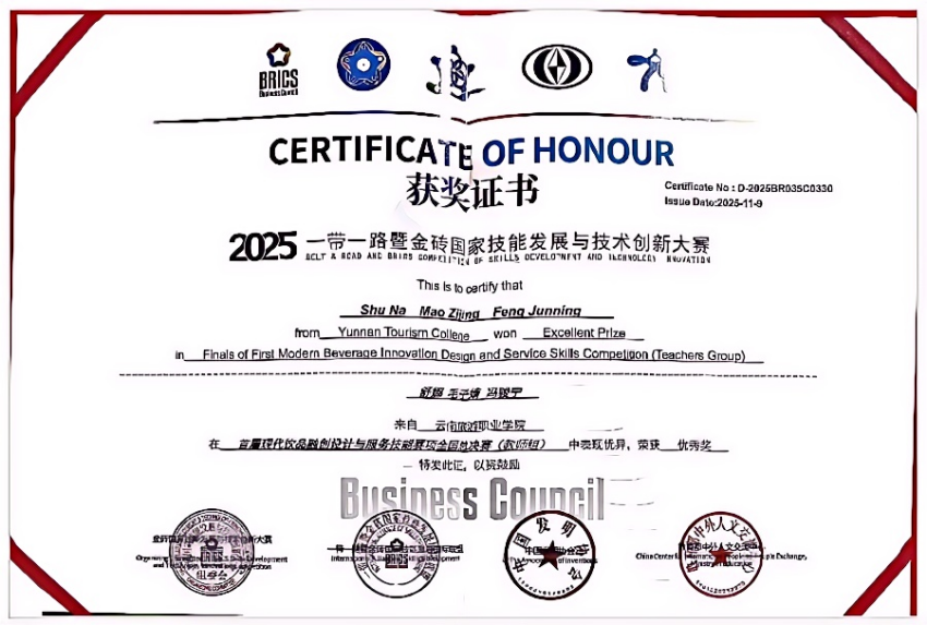 近日,2025一带一路暨金砖国家技能发展与技术创新大赛首届现代饮品融创设计与服务技能赛项全国总决赛在四川圆满落幕。由我校酒店管理学院冯骏宁、毛子婧、舒娜教师组成的参赛队凭借扎实的专业功底、创新的设计理念和出色的现场表现,在教师组激烈角逐中脱颖而出,荣获优秀奖。