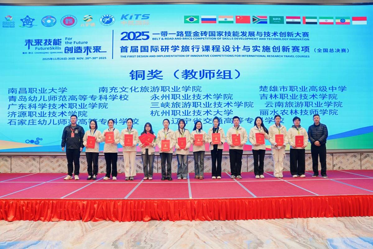 11月26日至29日,2025“一带一路”暨金砖国家技能发展与技术创新大赛之首届国际研学课程设计与实施创新赛项全国总决赛在重庆旅游职业学院圆满落幕。本次大赛汇聚了全国122支参赛队伍、691名师生同台竞技。我校旅游管理学院积极组队参赛,派出1支学生队伍与1支教师队伍出征,最终凭借扎实的专业功底、创新的设计理念与稳定的现场表现,斩获职教组一等奖1项、教师组三等奖1项,指导老师获评“优秀指导老师”,学校荣获“最佳组织奖”,全方位彰显了我院研学旅行专业“师生共育、岗课赛证融通”及国际视野人才培养的实力。