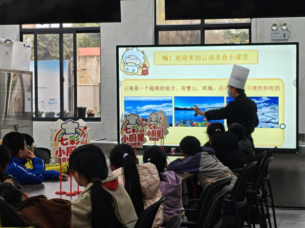 12月25日,我校烹饪学院联合龙泉路小学开办的《劳动教育》——糖画课后服务班举办了一场生动有趣的“非遗菜品制作体验”活动。本次活动在我校数字化实训室举行,26名龙泉路小学学生在我校志愿者的带领下,沉浸式感受了云南非遗美食的独特魅力。
