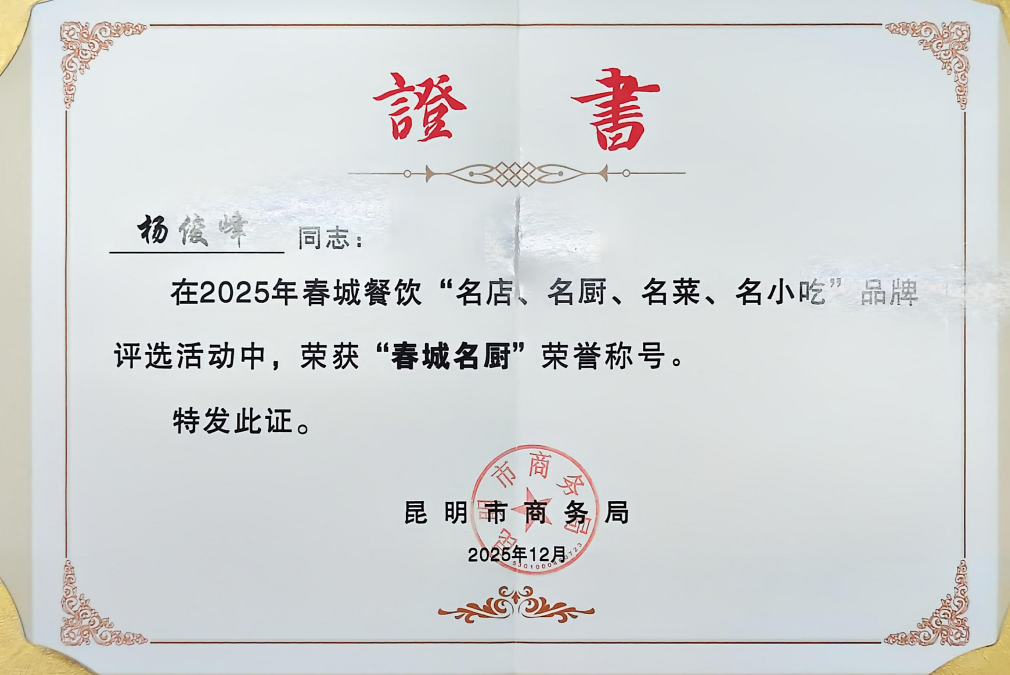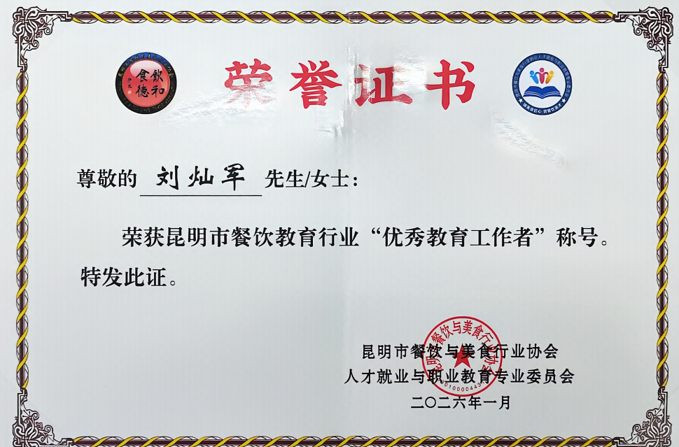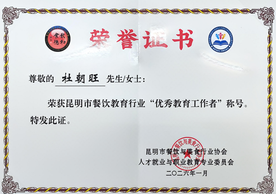 同时,在行业专项表彰中,杨俊峰、刘灿军、杜朝旺三位教师凭借在餐饮教育领域的深耕细作与突出贡献,荣获昆明市餐饮教育行业“优秀教育工作者”称号;杨俊峰老师在2025年春城餐饮“名店、名厨、名菜、名小吃”品牌评选活动中,凭借精湛的烹饪技艺获评“春城名厨”荣誉称号。