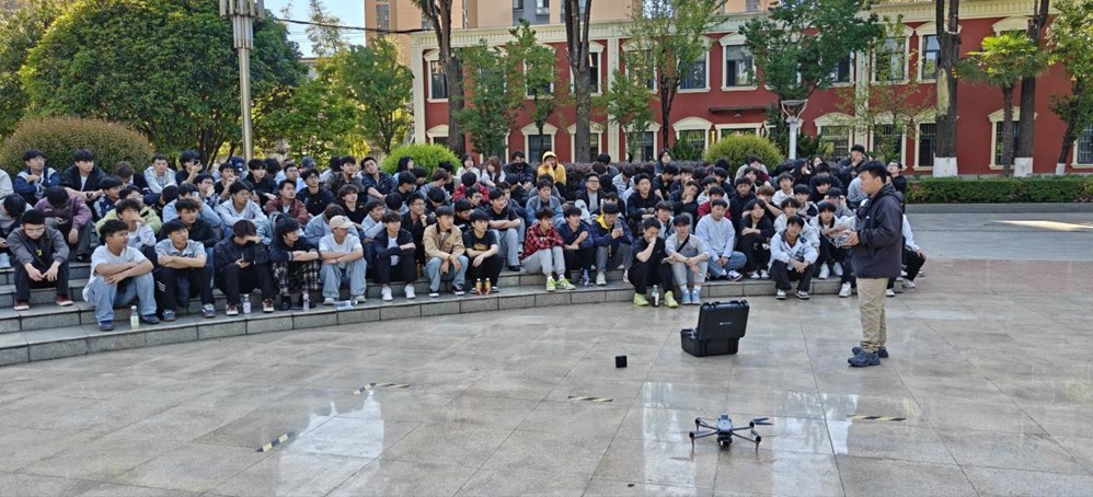 理论培训结束后,全体师生前往和谐广场开展户外实景飞行演示与实操体验。教师团队现场演示无人机喊话、探照灯、平稳起降、定点拍摄等功能与操作,并组织学生分批上手练习,全程一对一指导,帮助学生在真实场景中提升操控能力。