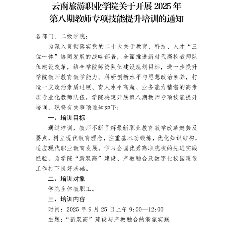云南旅游职业学院关于开展 2025 年第八期教师专项技能提升培训的通知