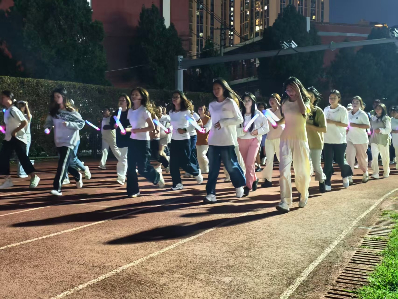 当发令信号响起,师生们身着荧光装备,环绕足球场跑道开启1.6公里荧光跑。夜色中,荧光道具随步伐闪烁,形成了流动光带。