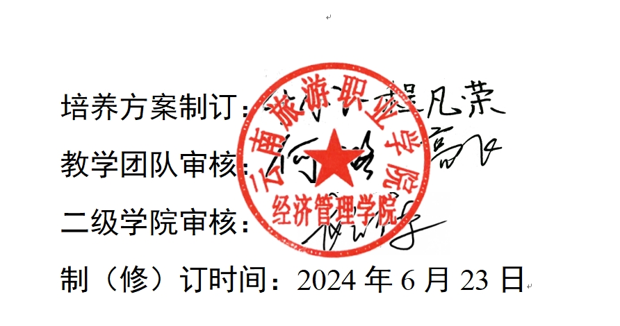 本专业培养方案的实施着重于提高人才培养质量、专业在全省的质量排序和社会影响力。打造云南旅游职业学院校级/省级高水平专业群2个;科学构建专兼职教师合理搭配的师资队伍,建设1支校级并冲击省级教师教学创新团队;创新教学方法,提高教师教学水平,在省级及以上教师教学能力大赛中能获等奖以上1个/年,省级及以上课题1个/年;力争校级或省级教学成果奖1个;校级在线精品课程1门,省级在线精品课程1门,自编1本专业教材;改善教学条件,新增校外实训基地1个,建立1个校级并力争省级技能大师工作室;学生技术技能突出,本级学生获省级及以上学生技能大赛等奖1项。