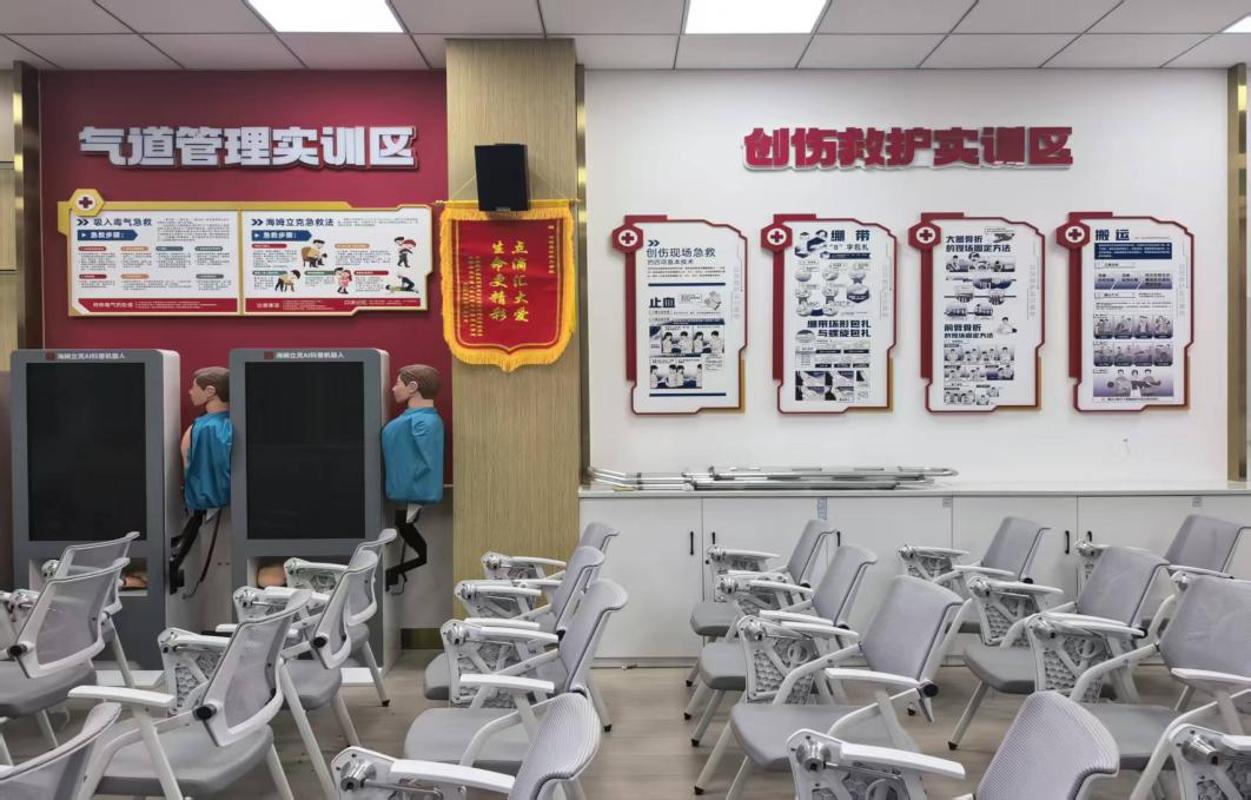 新建成的应急救护实训室设计科学合理、设施设备先进、功能齐全完备,不仅配置了心肺复苏交互实训套件、海姆立克AI互动实训套件、自动体外除颤器(AED)训练机、创伤模拟人等现代化急救训练器材,还科学设置了多种旅游活动突发场景模拟模块。该实训室实现了由传统理论课堂向高度仿真"实战"环境的转变,学生可通过沉浸式演练,系统掌握从判断评估、急救呼救到心肺复苏、创伤包扎等应急救护全流程技能,有效提升学用结合实效,为即将从事一线服务工作的学生沉着应对突发状况、筑牢生命安全防线奠定了坚实基础。