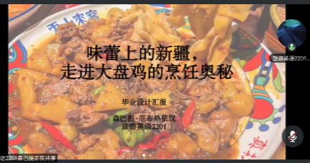 答辩过程中,三名学生毕业设计各具亮点,一致受到教研室教师们好评。森巴提·厄布热依汉同学毕业设计作品为“味蕾上的新疆——走进大盘鸡的烹饪奥秘”。该生讲解了大盘鸡这一传统新疆美食的烹饪方法,并亲自演示了大盘鸡的制作过程。讲解视频画面优美,语音语调较好,讲解质量高。易德永同学毕业设计作品为“美丽瀑布之乡——黄连河”。该作品全面展示了云南省大关县黄连河瀑布群的生态价值与旅游开发潜力。陈其楠同学毕业设计作品为“世界腾冲,天下和顺——和顺古镇”。该作品体现了学生对家乡的热爱,有力传播了家乡特有美食及文化,作品感召力强。