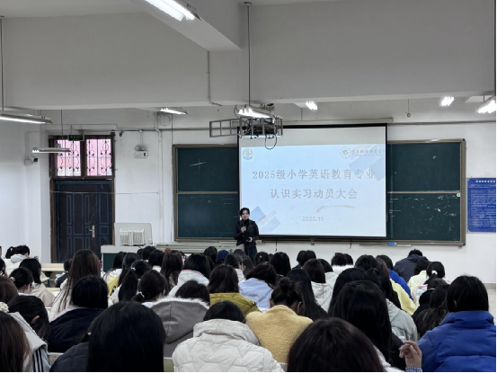 为夯实小学英语教育专业人才培养根基,助力新生筑牢职业认知、涵养专业素养,2025年11月24日至28日,外语学院组织2025级小学英语教育专业全体学生,开展了为期五天的专业认识实习。作为大学生入学后的首次专业实习,此次实习以“初识教坛、锤炼技能、培育初心”为核心,搭建“校校衔接”的实践桥梁,组织全体新生走出大学校园、沉浸式走进小学校园的课堂,助力专业新生完成从“学生”到“准教师”的角色认知转变。在动员大会上,外语学院党政负责人重点强调了生命财产、交通、食品、防诈骗、意识形态等安全问题,明确实习底线并围绕“做什么、怎么做、达何效”,解读了实习环节与目的,为新生高效参与实践划定目标、筑牢保障。